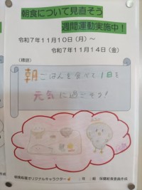 11月10日~14日の「朝食について見直そう週間」では、朝食摂取率100%を目指して、保健給食委員がポスター作成や放送でのクイズ実施など工夫を凝らしながら朝食の大切さについて全校生に呼びかけを行って...