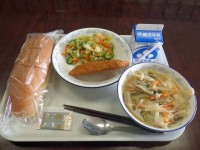 ひき肉とホクホク豆がアクセントになっているピリ辛カレーを、ミネラル豊富な和風サラダとともにおいしくいただきました。甘酸っぱいストロベリーヨーグルトでお口もサッパリ。今日もごちそうさまでした。