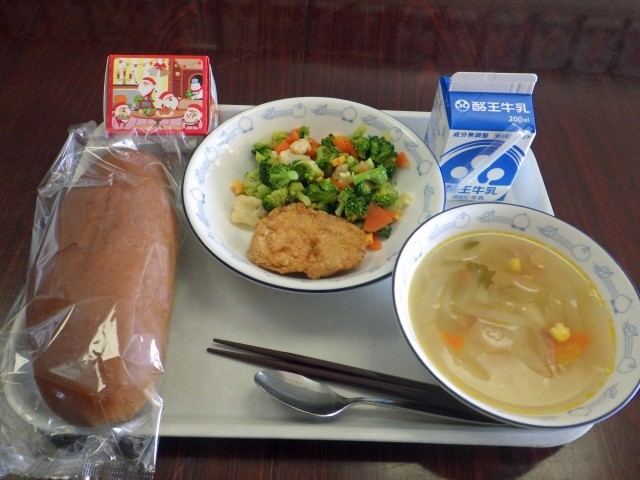 フライドチキンはしっかりとした味付けで衣の食感もよくとてもおいしかったです。星形チーズ入り野菜とコンソメスープと共にいただきました。ミニといいながら十分なボリュームのある黒パンとお待ちかねのクリスマス...