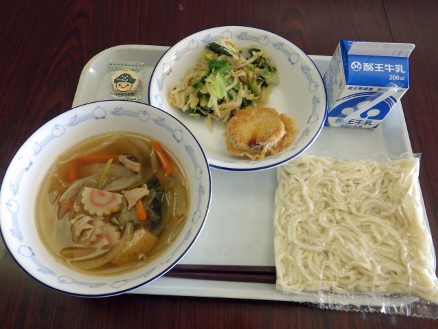3学期の最初の給食は、チキンカツです。衣がサクサク、お肉はジューシー、最高です。ワンタンスープは、野菜がしっかり取れて、気温が低い本日のような環境では、身も心も暖まる一品です。ごちそうさまでした。