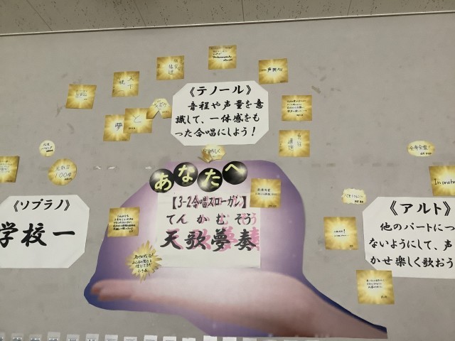 昨日は2年生の合唱リハーサルでした。あと一週間。みんなでつくる合唱に向けて・・・。3年生の各教室には合唱についての掲示が・・・。どこに注意して歌うか、何を意識して歌うのか・・・その意気込みが伝わってきますね。