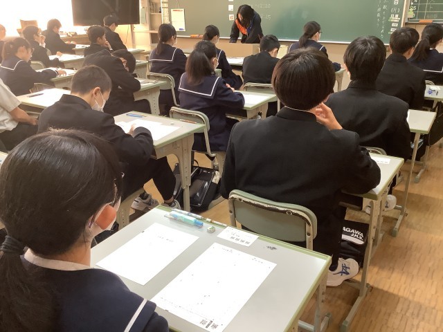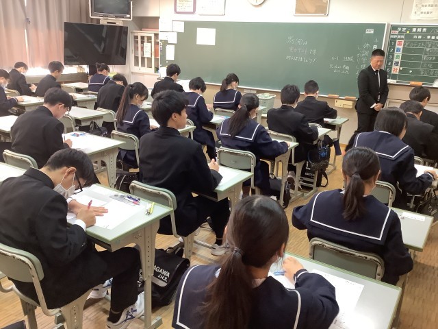 10月27日、月曜日、3年生は5教科の実力テストが行われました。2学期からは毎月、何かしらのテストがある3年生。朝自習の時間も静かにテスト勉強をしていました。県立高校と同じように国語から始めて・・・。1校時のテストが始まりました。