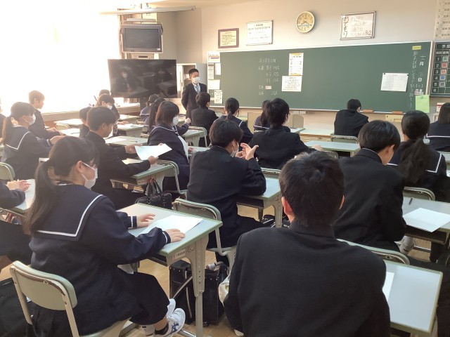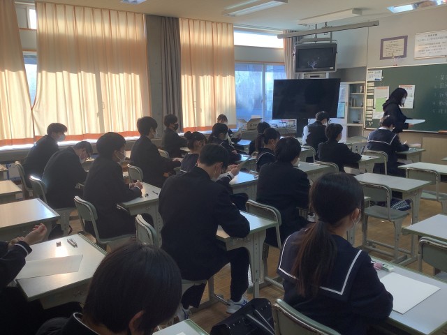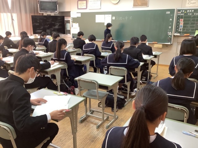 11月5日、本日は2学期末定期テストです。しかし、1年生でインフルエンザでの欠席が多いため、1年3組が明日まで学級閉鎖となり、2~3年生だけでの定期テストになりました。1年生は学級閉鎖明けの7日に行う予定です。最近、天候の寒暖差が大きいため、調子を崩している生徒もいますが、みんな真剣に朝自習に取り組んでいます。特別時間割となった本日、1校時目のテストが始まりました。写真は3年生の各クラスです。