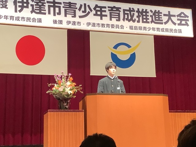 11月8日土曜日、伊達市ふるさと会館で、青少年育成推進大会がありました。本校から幕田幸穂さん、中村大志さんが少年の主張を発表しました。二人とも身近なテーマから、今自分が考えていること、そしてできること・・・。表現や言葉を大事にした発表が伝わりました。中村さんは喜多方で行われた県大会にも出場し、今回、代表で賞状を授与しました。