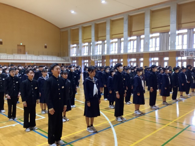 第3学期が始まりました。最初に始業式が行われ、新年の抱負として1年、大畑奏芽さん、2年、今井紗菜さん、3年、大橋侑昊さんが発表しました。1,2年生は普段の生活や勉強、そして部活動について、3年生は受験や、最後の学期を一緒に過ごす仲間たちへの思いなど、それぞれの学年の状況を踏まえた素晴らしい抱負でした。最後に表彰披露が行われ、式が閉じました。新たなステージに向けて、今学期、1日1日を充実したものに!