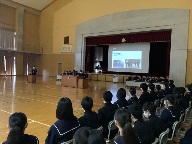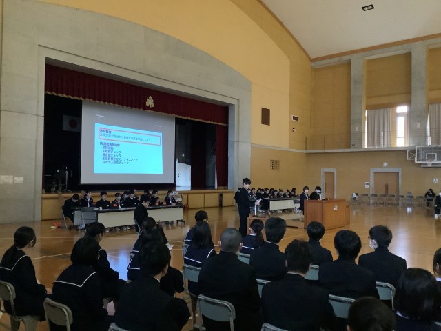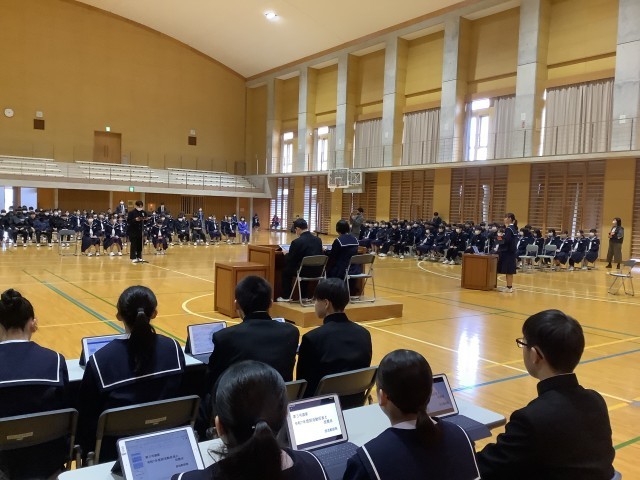 2月16日、午後に生徒会総会が行われました。生徒会役員、各委員会委員長、部活動部長などが要項や会場の準備を行い、総会に臨みました。生徒からの質問や意見も建設的なものが多く、学校生活を考えながら審議した様子がうかがえます。