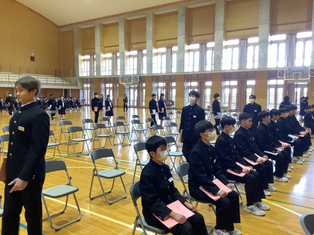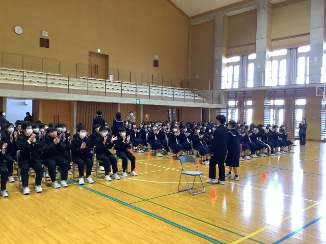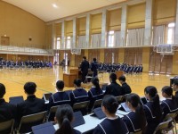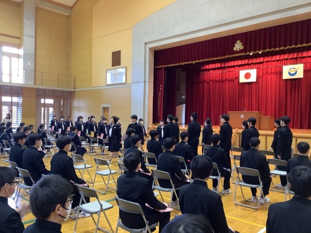 2月17日、全校生徒による卒業式練習、全校集会が行われました。初めに各種表彰披露があり、スペリングコンテストの表彰も行われました。その後、卒業生退場や入場、証書授与、礼法などについて確認し、全体で合わせました。全校生が卒業式の意味を確認し、卒業生のためにできることを・・・!