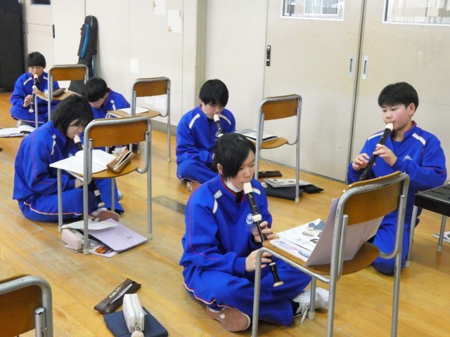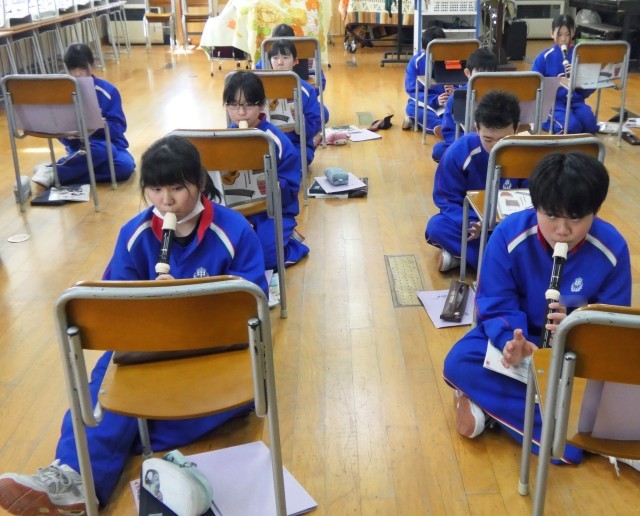 生徒たちは楽譜を真剣に見つめ、指使いを確認しながら一音一音を丁寧に奏でています。