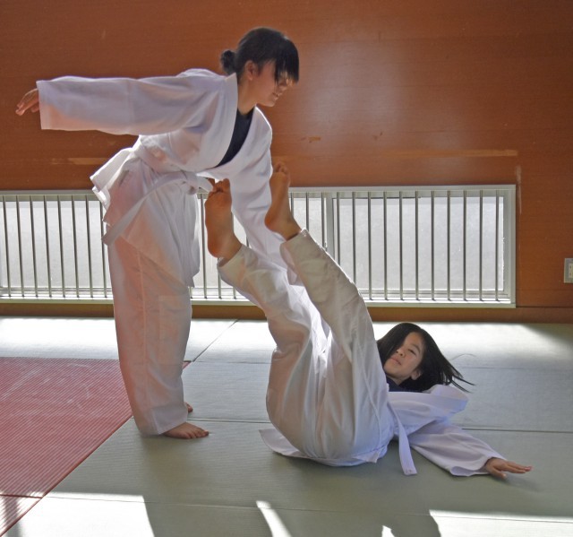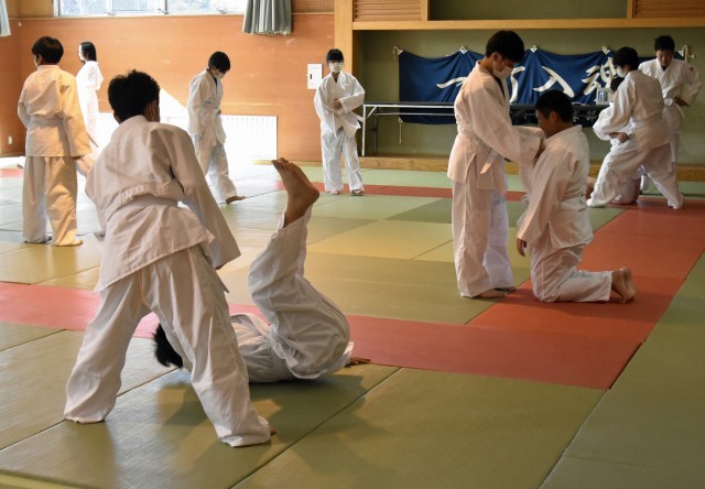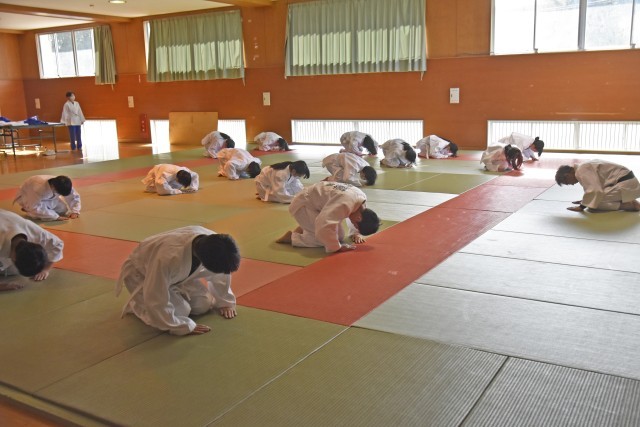 1年2組 保体 柔道 受け身 引き手は最後まで離さないようにします