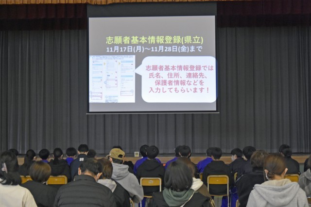 3年生と保護者の皆様を対象に、高校入試説明会を実施しました。今年度は、県立高校のWEB出願導入による手続きの変更や、私立高校の学科再編など、大きな変化があります。説明会では、これらの変更点や今後の具体的な日程・手続きについて説明しました。3年生一人一人が、希望の進路を実現できるよう、本校教職員一同、最後まで全力で支援してまいります。