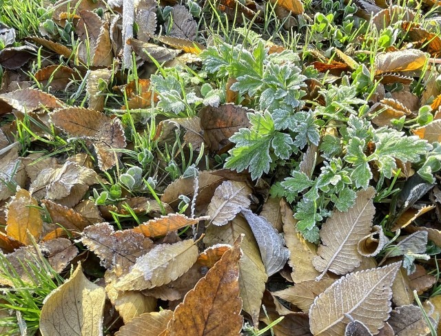 今朝は0℃と冷え込みましたが、校庭には美しい霜の世界が広がっていました。