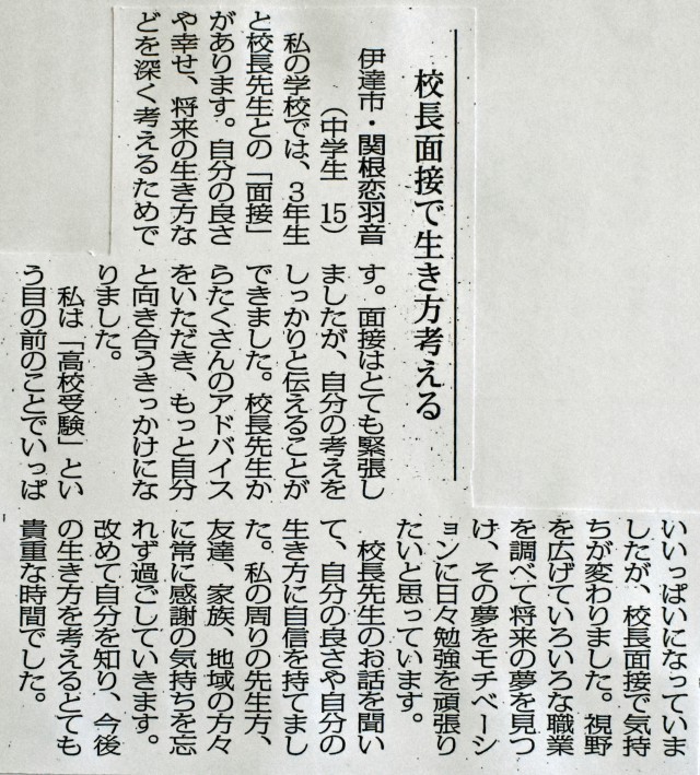 3年関根さんの校長面接に関する作文が、本日11月28日(金)の福島民報「みんなのひろば」に掲載されました。素直でしなやかな感性が光る素晴らしい内容です。