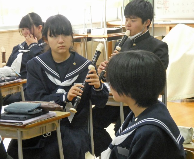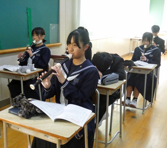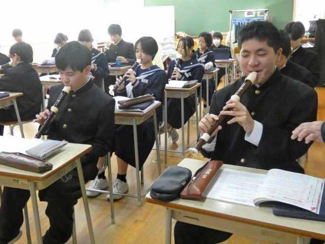 1月14日(水)1校時の授業 公開日 2026/01/14 更新日 2026/01/14 トピックス 1年1組 音楽 アルトリコーダー低音の指使いを確認し、オーラリーやアメージンググレイスの演奏に取り組みました。