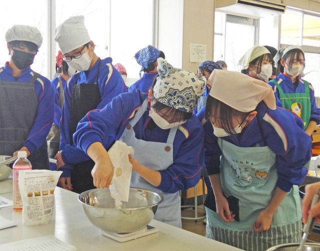 実習では、JAふくしま未来および婦人会の皆様に講師としてお越しいただき、材料の提供から、計量、生地の焼き上げまで丁寧にご指導いただきました。