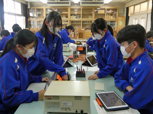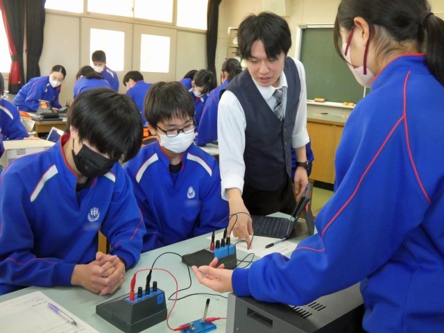2月2日(月)3校時の授業 公開日 2026/02/02 更新日 2026/02/02 トピックス 2年2組 理科 研究授業 電流と電圧は、どれくらいの割合で大きくなるか?生徒たちは各班で回路を組み立て、電圧を変化させたときに流れる電流の値を測定していました。