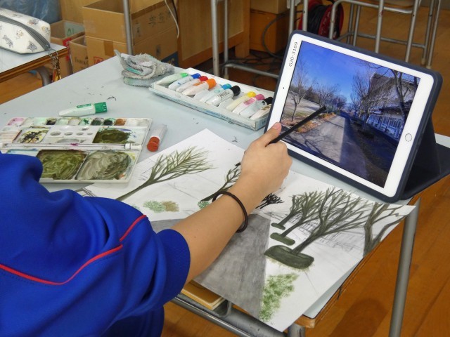 生徒たちはタブレット端末で、校内の廊下や風景を撮影した写真を活用しています。画面を細部まで確認しながら、透視図法を用いて複雑な奥行きを丁寧に描き出していました。