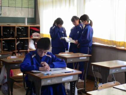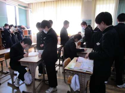 休み時間も 最後の確認 公開日 2018/02/15 更新日 2018/02/15 重要 テストの間の休み時間は、最終確認。 自分のノートを見直したり、友だちと問題を出し合ったり。 目標点数はとれたでしょうか。 明日も3校時までテストです。がんばれ、松陽生。