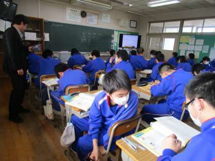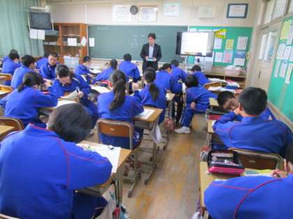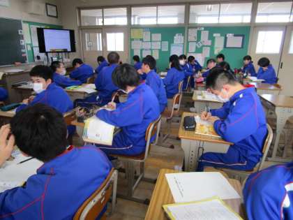 教科書のモデル文を参考に、自分の好きな本や映画など、友だちと相談しながら原稿を考えていました。