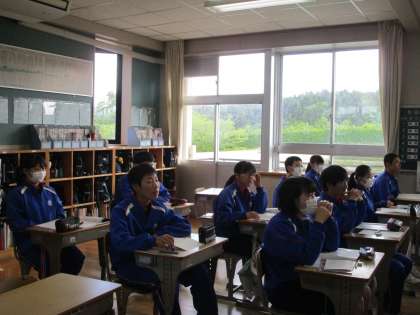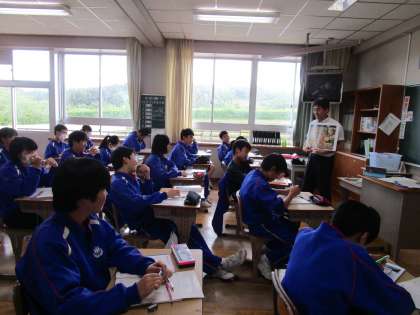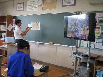 浮世絵を題材に英語の表現を理解します。タブレットを活用してテレビ画面に大きく映して学習を進めていました。