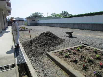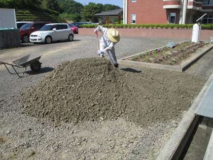 花壇の間が雨が降ると水たまりになることを伊達市教育委員会にお伝えしたところ、ダンプ1台分の砕石を届けてくださいました。松陽中の教育環境がさらに良くなります。ありがとうございます。地域の方々の応援に感謝しています。(庁務員さんが暑い中、ならしてくれました。)