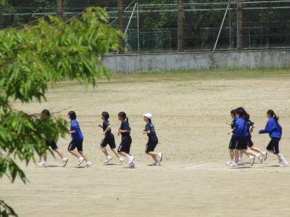 気持ちの良い青空の下、陸上競技の授業です。湿度が低く、からっとした暑さです。 いい汗を流しました。