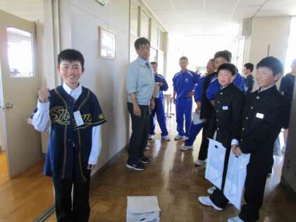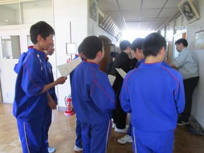 職員室前に集合した野球部員。1年生には待っていたユニフォームが届きました。 今週末の練習試合の計画も渡され、やる気もアップ。