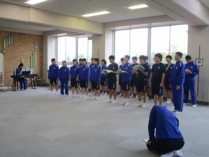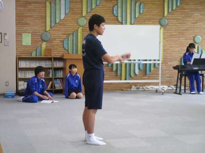 3学年ホール。学級全体で合唱練習。きちんと歌えているか、楽譜を確認する係も。より良いものを目指して。