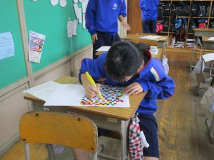 ビッグアートに取り組む生徒。1マス1マス 丁寧に。