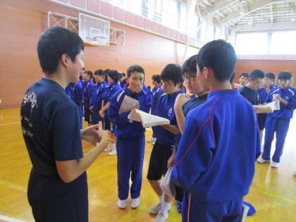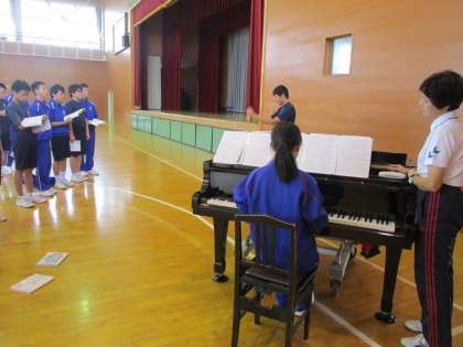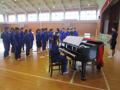 体育館の割り当て練習中の3年生。 どうすればもっと良くなるか、みんなで考えながら合唱練習をしていました。