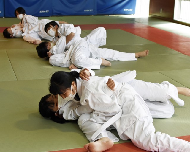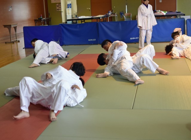 1年2組 保体 柔道 受け身 引き手は最後まで離さないようにします