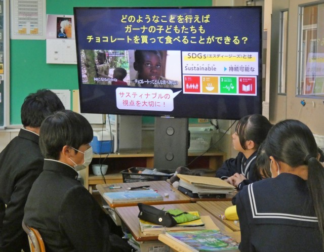 1年2組 社会 ガーナの子どもたちが、カカオの収穫の仕事をしているにも関わらず、チョコレートがどんな食べ物がわからない現状を踏まえ、どのようなことを行えば、ガーナの子どもたちもチョコレートを買って食べることができるか考える。