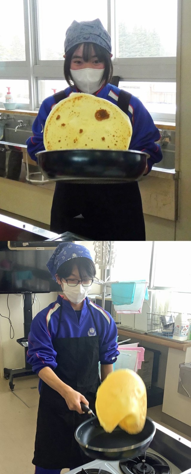 生徒たちは、薄くきれいに生地を焼き上げようと真剣そのもの。フライパンで見事に生地を裏返せたときには、歓声が上がっていました。