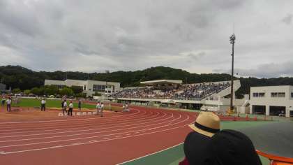 県中体連陸上大会がいわき市陸上競技場で開催されています。本校からも男子共通400m に出場します。