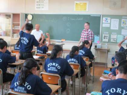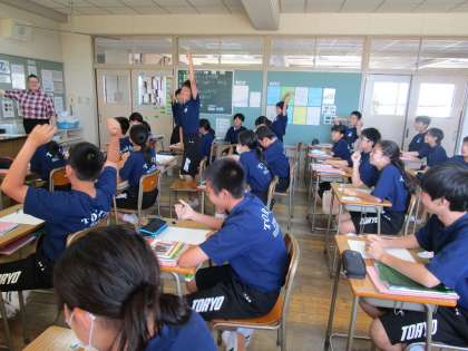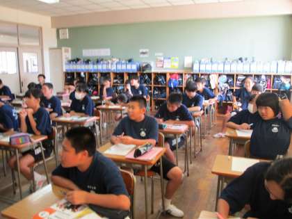 英文を書く練習をしています。とても元気がよく子どもたちの声が廊下まで聞こえてきます。