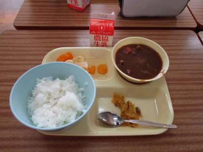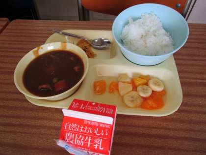 今日のメニューは ・ポークカレー ・福神漬け ・フルーツポンチ ・ご飯 ・牛乳 です。 おいしそうです。