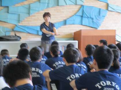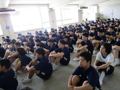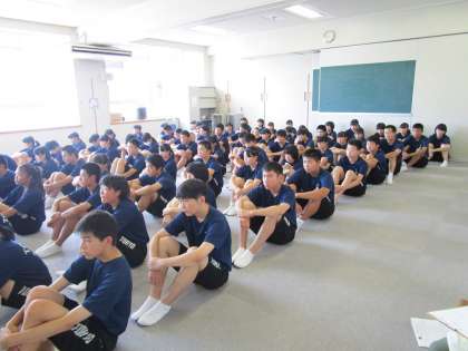 夏休みの過ごし方特に学習の進め方を中心に話をしています。エアコンの効いたホールです。