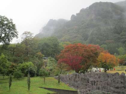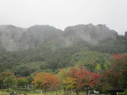本日 霊山の山並みは霧に覆われています。紅葉にはまだ早いです。
