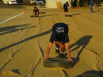タイヤを元気に押しています。