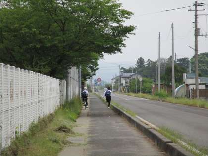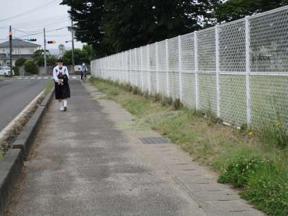 学校脇の通学路。歩道まで飛び出していた桜の枝を庁務員さんが切りました。また自転車通学の生徒の安全のために、除草も行っています。