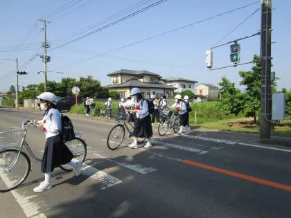 学校前の横断歩道を自転車から降りてわたる生徒たち。