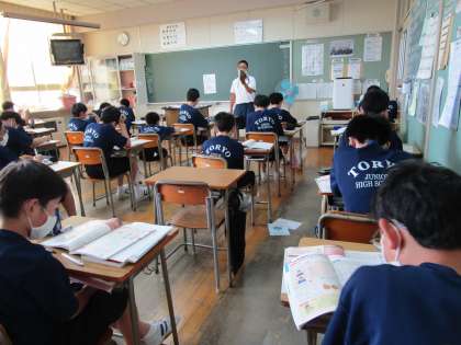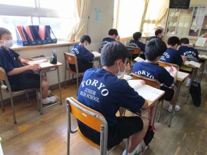 今日は気温が高く、熱中症予防のため、男女とも教室で保健を学習しました。男子は心と体の関わりについて、女子は知的機能と情意機能の発達について学びました。