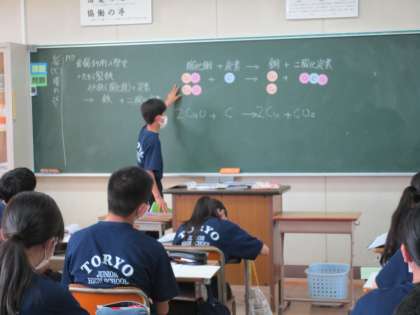 今日は金属利用の歴史について学びました。酸化銅と炭素が銅と二酸化炭素に変化する様子を原子カードを使ってみんなで完成させました。また還元や酸化についても学びました。