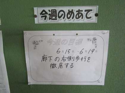 廊下でぶつからないよう、また新型コロナウイルス感染防止のためのソーシャルディスタンスを確保するために、めあてを意識して生活しましょう。
