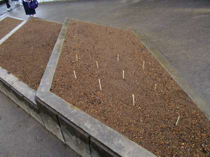 正門前の花壇に、何やら目印の棒が並んでいました。