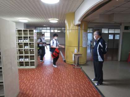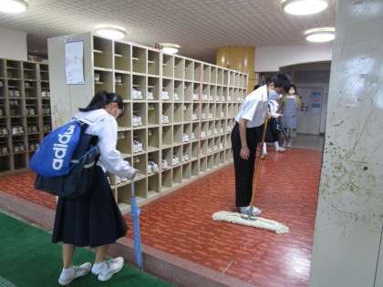 廊下がぬれるので、先生方やボランティアの生徒でモップ掛けです。