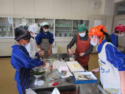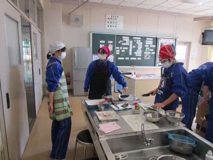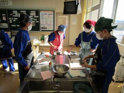 実習で、ムニエル、粉ふきいも、いんげんを調理しました。分担し、協力して進めていました。
