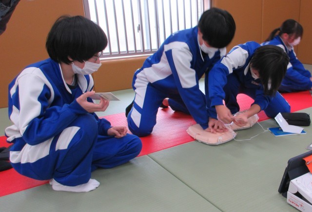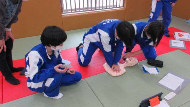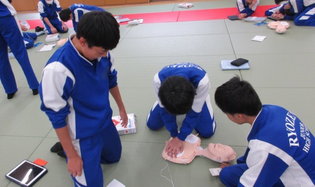 発見者、通報者、AEDを取りに行く者、救助者など、役割分担をして学習しています。