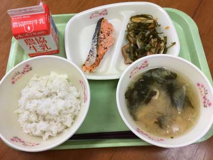 本日のメニューは、麦ごはん/じゃがいもとキャベツのみそ汁/鮭のハーブ焼き/切り昆布の炒め煮/牛乳。
