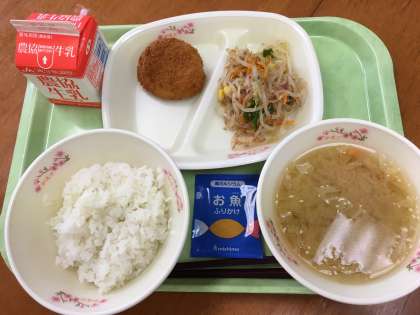 本日のメニューは、 ごはん/お魚ふりかけ/具だくさん汁/チキン梅カツ/ピーマンのおかか和え/牛乳。
