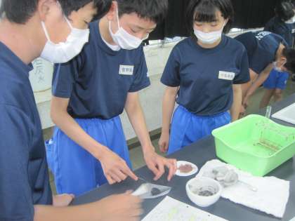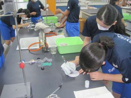 反応後の物質に金属光沢が見られるか,薬品さじでこすっています。